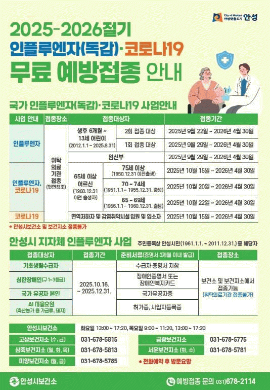 ¾È¼º½Ãº¸°Ç¼Ò °ü°èÀÚ´Â ¡°ÀÎÇ÷翣ÀÚ¿Í Äڷγª19´Â ÇØ¸¶´Ù À¯ÇàÇÏ´Â ¹ÙÀÌ·¯½º°¡ ´Þ¶ó ¸Å³â Àû±â¿¡(9~12¿ù) Á¢Á¾À¸·Î ¹Ì¸® ¿¹¹æÇÏ´Â °ÍÀÌ °¡Àå È¿°úÀûÀÌ¸ç ¡°Á¢Á¾ ´ë»óº°·Î Á¢Á¾ ÀÏÀÚ°¡ ´Ù¸£´Ï ÀÏÁ¤À» ²À È®ÀÎÇÏ°í ½ÅºÐÁõÀ» ÁöÂüÇÏ¿© À§Å¹ÀÇ·á±â°üÀ» ¹æ¹®ÇØ ´Þ¶ó¡±°í ´çºÎÇß´Ù.
