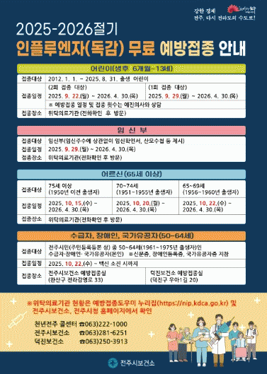 ¶Ç ÀüÁֽÿ¡ ÁÖ¼Ò¸¦ µÐ 50~64¼¼ÀÇ Ãë¾à°èÃþ ´ë»óÀÚ(±âÃÊ»ýȰ¼ö±ÞÀÚ¿Í Àå¾ÖÀÎ, À¯°øÀÚ)ÀÇ °æ¿ì¿¡µµ 10¿ù 22ÀϺÎÅÍ ½ÅºÐÁõ°ú Àå¾ÖÀεî·ÏÁõ, ±¹°¡À¯°øÀÚÁõÀ» ÁöÂüÇϸé ÀüÁֽú¸°Ç¼Ò¿Í ´öÁøº¸°Ç¼Ò¿¡¼ ¹é½Å ¼ÒÁø½Ã±îÁö ¹«·á·Î ÀÎÇ÷翣ÀÚ ¿¹¹æÁ¢Á¾À» ¹ÞÀ» ¼ö ÀÖ´Ù.