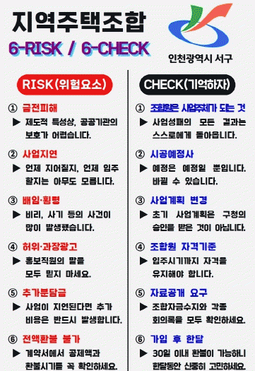 ¼±¸´Â Áö¿ªÁÖÅÃÁ¶ÇÕÀÇ Àü±¹Àû ÆÄ»ê »ç·Ê¿Í »ç¾÷ Á¤Ã¼·Î ÀÎÇÑ ÇÇÇØ°¡ ¸¸¿¬ÇÔ¿¡ µû¶ó ±¸¹ÎÀÇ ÀÌÇØµµ¸¦ ³ôÀÌ°í º¸´Ù ½ÅÁßÇÏ°Ô »ç¾÷¿¡ Âü¿©ÇÒ ¼ö ÀÖµµ·Ï Áö¿øÇϰíÀÚ Á¶ÇÕÀÇ À§Çè ¿ä¼Ò¿Í °¡ÀÔ Àü È®ÀÎÇØ¾ß ÇÒ ÁÖ¿ä »çÇ×À» ´ãÀº ¡®Áö¿ªÁÖÅÃÁ¶ÇÕ 6-RISK / 6-CHECK¡¯¸¦ ¼Ò½ÄÁö¿Í ¾È³»¹® µîÀ» ÅëÇØ Áö¼ÓÀûÀ¸·Î ¹èÆ÷ÇÒ °èȹÀÌ´Ù.