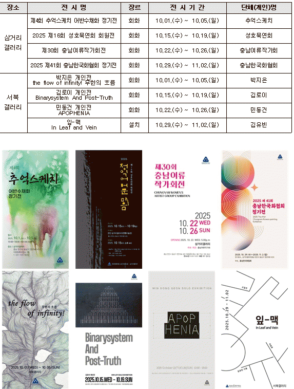 »ï°Å¸® °¶·¯¸®¿¡¼´Â ¡ã10¿ù 1~ 5ÀÏ, Á¦4ȸ Ã߾コÄÉÄ¡ ¾î¹Ý¼öÃ¤È Á¤±âÀü ¡ã10¿ù 15~ 19ÀÏ, 2025 Á¦16ȸ ¼ºÈ£¹¬¿¬È¸ ȸ¿øÀü ¡ã10¿ù 22~ 26ÀÏ, Á¦30ȸ Ãæ³²¿©·ùÀÛ°¡È¸Àü ¡ã10¿ù 29ÀÏ~ 11¿ù 2ÀÏ, 2025 Á¦41ȸ Ãæ³²Çѱ¹ÈÇùȸ Á¤±âÀüÀÌ ¿¸°´Ù.