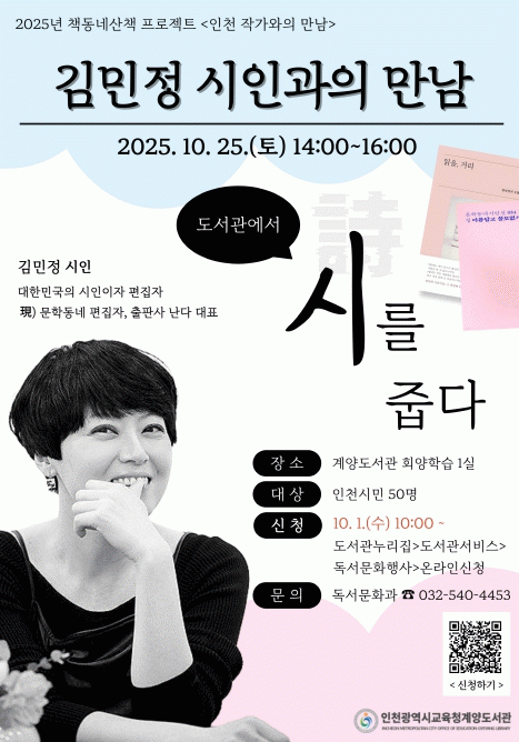 ¡®µµ¼°ü¿¡¼ ½Ã¸¦ ÁÝ´Ù¡¯¸¦ ÁÖÁ¦·Î ¿¸®´Â À̹ø ÇÁ·Î±×·¥¿¡¼ ±è¹ÎÁ¤ ½ÃÀÎÀº ÀÛǰ ¼¼°è¿Í ½Ã¿¡ °üÇÑ ´Ù¾çÇÑ À̾߱⸦ µ¶ÀÚµé°ú ³ª´©¸ç ¹®ÇÐÀû °ø°¨À» Çü¼ºÇÒ ¿¹Á¤ÀÌ´Ù.