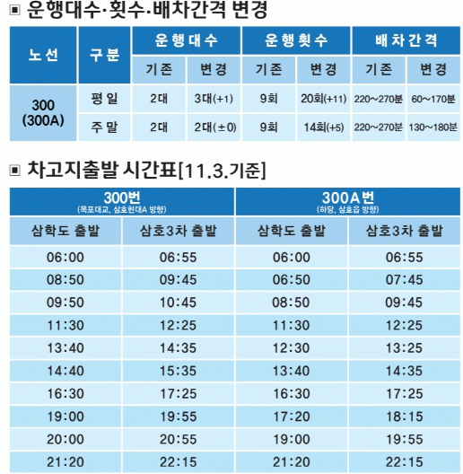 À̹ø ³ë¼± °³ÆíÀ¸·Î 11/3ÀϺÎÅÍ ¸ñÆ÷½Ã´Â ¸ñÆ÷´ë±³¿Í »ïÈ£Çö´ë¾ÆÆÄÆ®¸¦ °æÀ¯ÇÏ´Â 300¹ø, ÇÏ´ç°ú »ïÈ£À¾À» ¿À°¡´Â 300A¹ø ½Ã³»¹ö½º¸¦ ¿îÇàÇÑ´Ù.