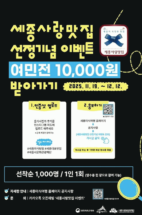 Àç´ÜÀº ¼±Á¤µÈ ¼¼Á¾»ç¶û¸ÀÁýÀ» ¹æ¹®ÇÑ µÚ Èı⸦ ³²±ä Âü¿©ÀÚ ¼±Âø¼ø 1,000¸í¿¡°Ô 1Àδç 1¸¸ ¿ø »ó´çÀÇ Áö¿ªÈÆó(¿©¹ÎÀü) À» Áö±ÞÇÒ ¿¹Á¤ÀÌ´Ù. À̺¥Æ® ±â°£Àº 12¿ù 12ÀϱîÁöÀ̸ç, À½½ÄÁ¡»Ó ¾Æ´Ï¶ó Ä«Æä¡¤º£ÀÌÄ¿¸® µî ´Ù¾çÇÑ ¾÷Á¾ÀÌ Æ÷ÇԵм¼Á¾ÀÇ Æø³ÐÀº ¹Ì½ÄÀ» °æÇèÇÒ ¼ö ÀÖ´Ù.