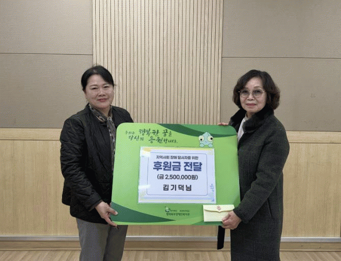 À̹ø ÈÄ¿øÀº ÆòÅúϺÎÀå¾ÖÀÎÁÖ°£º¸È£¼¾ÅÍ ±è±â´ö ÀÌ¿ëÀÎÀÇ À̸§À¸·Î º¸È£ÀÚ(¸ð) ÃÖÀº¼÷´ÔÀÌ ±âºÎ¸¦ ÁøÇàÇÑ °ÍÀ¸·Î, Àå¾Ö ´ç»çÀÚ¿¡ ´ëÇÑ µû¶æÇÑ ÀÀ¿ø°ú ³ª´®ÀÇ ¶æÀÌ ´ã°ÜÀÖ´Ù. Àü´ÞµÈ ÈÄ¿ø±ÝÀº ¿¬¸»À» ¸Â¾Æ Áö¿ª»çȸ Àå¾Ö ´ç»çÀÚµéÀÇ º¹Áö ÁõÁø°ú Áö¿ø »ç¾÷¿¡ ¼ÒÁßÈ÷ »ç¿ëµÉ ¿¹Á¤ÀÌ´Ù.