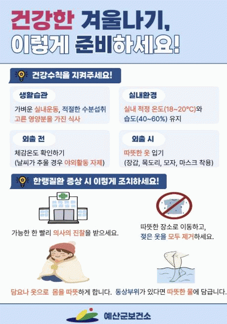 ±ºÀº ÇÑ·©Áúȯ ¿¹¹æÀ» À§ÇØ ¡â¿©·¯ °ãÀÇ µû¶æÇÑ ¿Ê ÀԱ⠡âÀå½Ã°£ ÃßÀ§ ³ëÃâ ÇÇÇϱ⠡â°í·ÉÀÚ¡¤¸¸¼ºÁúȯÀÚÀÇ ½Ç³» ÀûÁ¤ ¿Âµµ À¯Áö ¡â¼öºÐ ¼·Ãë ¡â¾ß¿Ü ±Ù·ÎÀÚ º¸¿Â¡¤È޽Ľð£ È®º¸ µîÀ» ±Ç°íÇÑ´Ù.