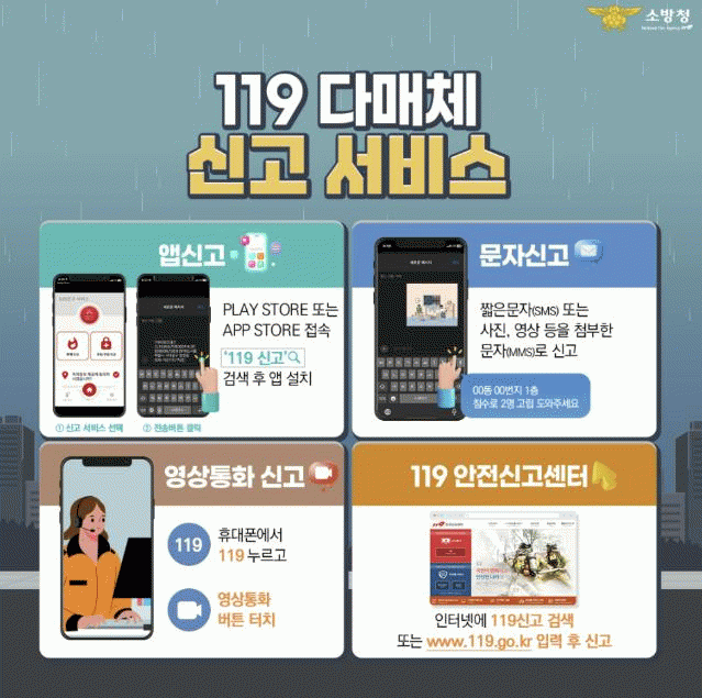 119´Ù¸Åü ½Å°í ¼ºñ½º´Â ±âÁ¸ À½¼ºÅëÈ»Ó ¾Æ´Ï¶ó ¡â¹®ÀÚ(SMS) ¡â¿µ»óÅëÈ ¡â119½Å°í ¾Û ¡âÀ¥ ½Å°í µî ´Ù¾çÇÑ ¸Åü¸¦ Ȱ¿ëÇØ ½Å°íÇÒ ¼ö ÀÖ´Â ½Ã½ºÅÛÀ¸·Î, »óȲ ¼³¸íÀÌ ¾î·Æ°Å³ª û°¢¡¤¾ð¾îÀå¾Ö µîÀ¸·Î ÅëȰ¡ Èûµç ½Ã¹Î¿¡°Ô Å« µµ¿òÀÌ µÇ°í ÀÖ´Ù.