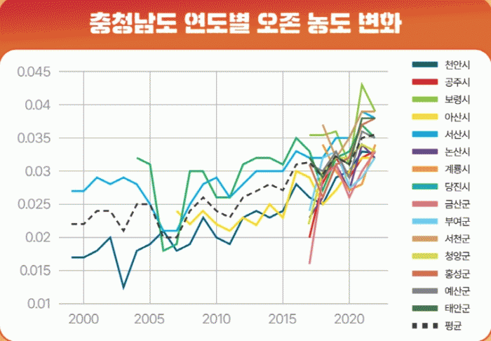 ±èÁ¾¹ü ¹Ú»ç´Â ¡°ÃæÃ»³²µµ´Â 2018³â µµ³» 15°³ ½Ã±º¿¡ µµ½Ã´ë±â ÃøÁ¤¼Ò¸¦ ¿ÏºñÇßÀ¸¸ç, ÇöÀç 40°³¼Ò°¡ ¿î¿µ Áß¡±À̶ó¸ç ¡°µµ³» Æò±Õ ¿ÀÁ¸ ³óµµ´Â 2018³â 30.4ppb¿¡¼ Á¡ÁøÀûÀ¸·Î »ó½ÂÇØ ¿ÔÀ¸¸ç, °èÀýº°·Î´Â Àڿܼ±ÀÌ °ÇÑ º½(41.8ppb)°ú ¿©¸§(38.0ppb)¿¡ ³ô°Ô ³ªÅ¸³µ°í, Áö¿ªº°·Î´Â ÇØ¾È°¡ Áö¿ª(º¸·É, ¼»ê, ÅÂ¾È µî)¿¡¼ ³óµµ°¡ ³ô°í ³»·úÀ¸·Î °¥¼ö·Ï ³·¾ÆÁö´Â °æÇâÀ» º¸¿´´Ù¡±°í ºÐ¼®Çß´Ù.