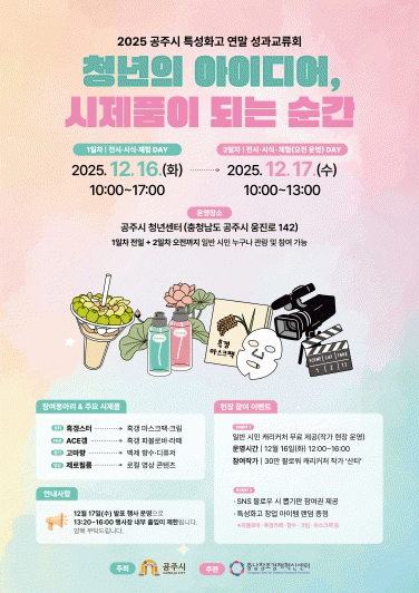 À̹ø Çà»ç´Â °øÁÖ»ý¸í°úÇÐ°í¡¤°øÁÖÁ¤º¸°í ÇлýµéÀÌ 1³â°£ °³¹ßÇØ ¿Â â¾÷ ¾ÆÀ̵ð¾î¸¦ ½ÇÁ¦ ½ÃÁ¦Ç°À¸·Î ±¸ÇöÇØ ½Ã¹Îµé¿¡°Ô ¼±º¸ÀÌ´Â ÀÚ¸®·Î, Àü½Ã¡¤½Ã½Ä¡¤Ã¼Çè µî ´Ù¾çÇÑ ¹æ½ÄÀÇ Âü¿© ÇÁ·Î±×·¥À» ÅëÇØ ÇлýµéÀÇ Ã¢ÀÇÀû ½Ãµµ¿Í ¼ºÀåÀ» È®ÀÎÇÒ ¼ö ÀÖµµ·Ï ±¸¼ºµÆ´Ù. ÇлýµéÀº ¾ÆÀÌÅÛ ±âȹ, ½ÃÀå Á¶»ç, µðÀÚÀÎ, ½ÃÁ¦Ç° Á¦ÀÛ±îÁö Àü °úÁ¤À» Á÷Á¢ ¼öÇàÇÏ¸ç ½ÇÀüÇü â¾÷ °æÇèÀ» ½×¾Æ ¿Ô´Ù.