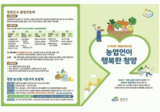 ±âÁذ¡°Ý º¸ÀåÁ¦ ½Åû ´ë»óÀº û¾ç±º¿¡ ÁÖ¼Ò¸¦ µÎ°í, ǪµåÇ÷£ °ü°è½ÃÀå(Çб³¡¤°ø°ø±Þ½Ä, Á÷¸ÅÀå)¿¡ ³ó»ê¹°À» ÃâÇÏÇÏ´Â ³ó¾÷ÀÎÀÌ´Ù. ½ÅûÀº Áö³ 21ÀϺÎÅÍ ½ÃÀÛµÆÀ¸¸ç ¿À´Â 2¿ù 20ÀϱîÁö °¡´ÉÇÏ´Ù. À¾¡¤¸é»ç¹«¼Ò »ê¾÷ÆÀ¿¡¼ Á¢¼öÇÒ ¼ö ÀÖ´Ù.