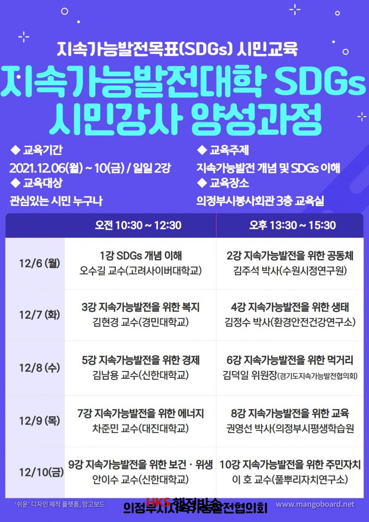 ¿ÃÇØ óÀ½À¸·Î ÁøÇàµÇ´Â ½Ã¹Î°»ç ¾ç¼º°úÁ¤Àº ¹ÎÁÖ,ÀαÇ,ÆòÈ,ȯ°æ µîÀÌ Æ÷ÇÔµÈ Áö¼Ó°¡´É¹ßÀü¸ñÇ¥(SDGs) 17°³¿¡ ´ëÇÑ °³³äÀÌÇØ¿Í ±âº»±³À°À¸·Î ±¸¼ºµÇ¾î ÃÑ 5Àϵ¿¾È ÁøÇàµÇ¸ç, ¿ì¼ö ±³À° À̼öÀÚ´Â SDGs ½Ã¹Î°»ç·Î À§ÃËÇÒ ¿¹Á¤ÀÌ´Ù.