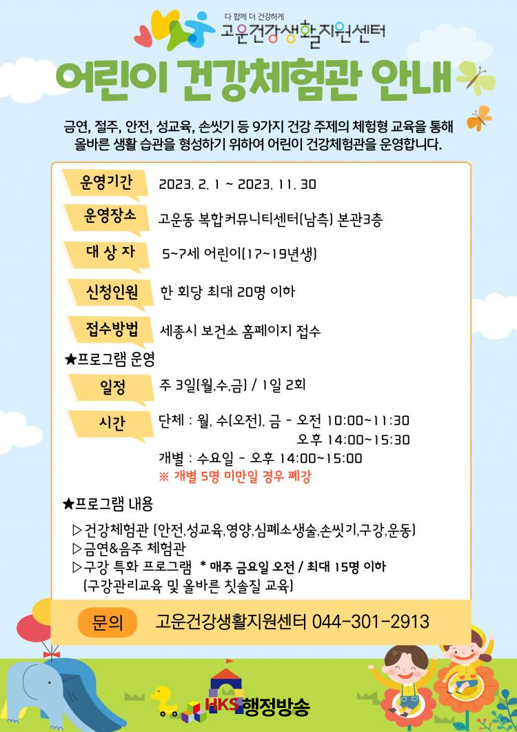 ¼¼Á¾Æ¯º°ÀÚÄ¡½Ãº¸°Ç¼Ò(¼ÒÀå °¹Î±¸)°¡ ¾Æµ¿µéÀÇ °Ç°ÇÑ ¼ºÀåÀ» µ½±â À§ÇØ ÀÌ´ÞºÎÅÍ 11¿ù±îÁö ¸ÅÁÖ ¿ù¡¤¼ö¡¤±Ý¿äÀÏ °í¿î°Ç°»ýȰÁö¿ø¼¾ÅÍ(°í¿îµ¿ ³²Ãøº¹ÇÕÄ¿¹Â´ÏƼ¼¾ÅÍ 3Ãþ)¿¡¼ ¾î¸°ÀÌ °Ç°Ã¼Çè°üÀ» ¿î¿µÇÑ´Ù.