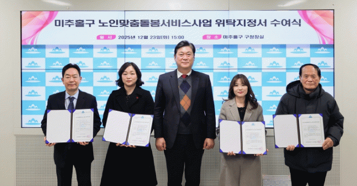 [HKSÇàÁ¤¹æ¼Û]ÀÎõ ¹ÌÃßȦ±¸´Â 23ÀÏ ±¸Ã»Àå½Ç¿¡¼ ¡®³ëÀÎ ¸ÂÃã µ¹º½¼ºñ½º »ç¾÷ À§Å¹ÁöÁ¤¼ ¼ö¿©½Ä¡¯À» °³ÃÖÇß´Ù. À̹ø ¼ö¿©½ÄÀº ±âÁ¸ À§Å¹ ±â°£ ¸¸·á¿¡ µû¶ó, °ø°³¸ðÁý°ú ¼öÇà±â°ü ¼±Á¤½ÉÀÇÀ§¿øÈ¸ÀÇ ½É»ç¸¦ °ÅÃÄ À§Å¹¹ýÀÎÀ¸·Î ¼±Á¤µÈ ¡¦