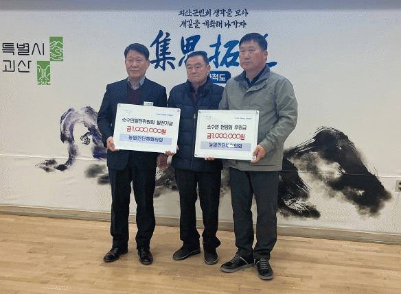 [HKSÇàÁ¤¹æ¼Û]ÃæºÏ ±«»ê±º ¼Ò¼ö¸é³ó¾÷ÀδÜüÇùÀÇȸ´Â 7ÀÏ ¼Ò¼ö¸é»ç¹«¼Ò¿¡¼ °ü³» Àα¸Áõ°¡ ¹× Áö¿ª°æÁ¦ Ȱ¼ºÈ¸¦ À§ÇØ ¼Ò¼ö¸é¹ßÀüÀ§¿øÈ¸¿Í ¼Ò¼ö¸é¹ø¿µÈ¸¿¡ °¢°¢ 100¸¸ ¿øÀ» Àü´ÞÇß´Ù.