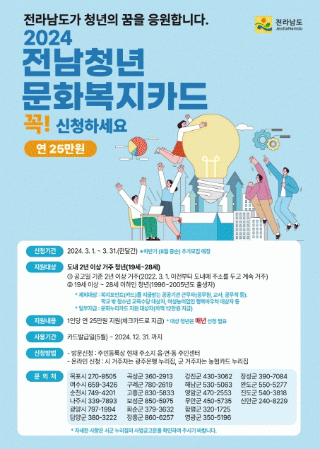 [HKSÇàÁ¤¹æ¼Û]¿µ±¤±ºÀº 3¿ù 1ÀϺÎÅÍ 31ÀϱîÁö ÇÑ ´Þ°£ 2024³â Àü³²Ã»³â ¹®Èº¹ÁöÄ«µå Áö¿ø»ç¾÷ ´ë»óÀÚ¸¦ ¸ðÁýÇÑ´Ù.