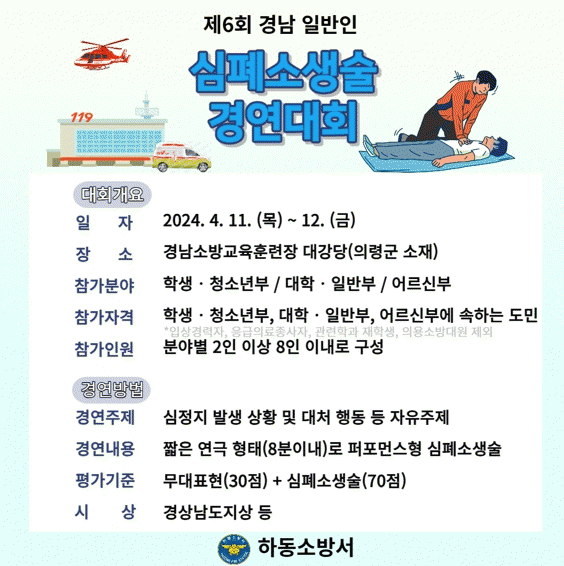 [HKSÇàÁ¤¹æ¼Û]Çϵ¿¼Ò¹æ¼´Â ¿À´Â 4¿ù 11ÀÏ,12ÀÏ ÀÌÆ²°£ ÁøÇàµÇ´Â ¡®Á¦6ȸ °æ³² ÀϹÝÀÎ ½ÉÆó¼Ò»ý¼ú °æ¿¬´ëȸ¡¯ Âü°¡ÆÀÀ» ¿À´Â 12ÀϱîÁö ¸ðÁýÇÑ´Ù.