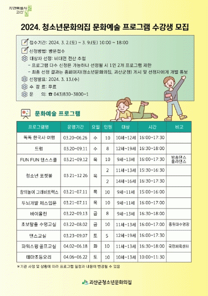 [HKSÇàÁ¤¹æ¼Û]ÃæºÏ ±«»ê±ºÃ»¼Ò³â¹®ÈÀÇÁýÀº 3¿ù 2ÀϺÎÅÍ Áö¿ª û¼Ò³âµéÀ» ´ë»óÀ¸·Î 2024 û¼Ò³â ¹®È¿¹¼ú ÇÁ·Î±×·¥ ¼ö°»ýÀ» ¸ðÁýÇÑ´Ù.