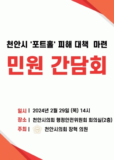 [ÃæÃ»±Ç] õ¾È½ÃÀÇȸ ÀåÇõ ÀÇ¿øÃµ¾È½Ã Æ÷ƮȦ ÇÇÇØ ´ëÃ¥ ¸¶·Ã °£´ãȸ °³ÃÖ |2024. 02.27