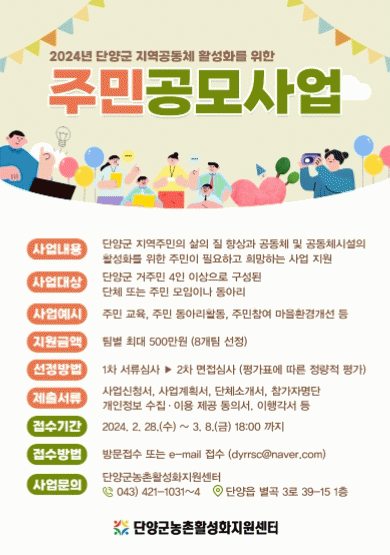 [HKSÇàÁ¤¹æ¼Û]´Ü¾ç±º³óÃÌȰ¼ºÈÁö¿ø¼¾ÅÍ´Â 2024³â ´Ü¾ç±º Áö¿ª°øµ¿Ã¼ Ȱ¼ºÈ Áֹΰø¸ð»ç¾÷ Âü¿©ÀÚ¸¦ ¸ðÁýÇÑ´Ù.