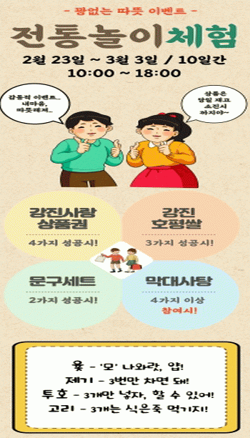 [HKSÇàÁ¤¹æ¼Û]¿À´Â 2¿ù 23ÀϺÎÅÍ 3¿ù 3ÀϱîÁö 10Àϰ£ °Áø±º ´ë±¸¸é °í·ÁûÀÚ ¿äÁö ÀÏ¿ø¿¡¼ °³ÃֵǴ Á¦52ȸ °ÁøÃ»ÀÚÃàÁ¦±â°£¿¡ °í·ÁûÀÚ¹Ú¹°°ü ¾Õ¿¡¼ ÀüÅë³îÀÌ Ã¼ÇèÇÁ·Î±×·¥ÀÌ ¿î¿µµÈ´Ù.