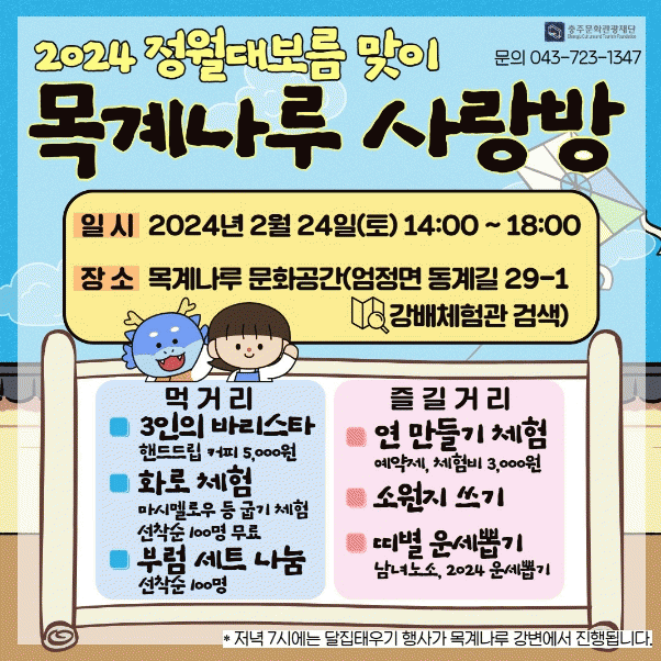 [ÃæÃ»±Ç] ÃæÁÖ¹®È°ü±¤Àç´Ü, Á¤¿ù´ëº¸¸§¸ÂÀÌ ¡®¸ñ°è³ª·ç »ç¶û¹æ¡¯ Ưº° À̺¥Æ® ¿î¿µ |2024. 02.16