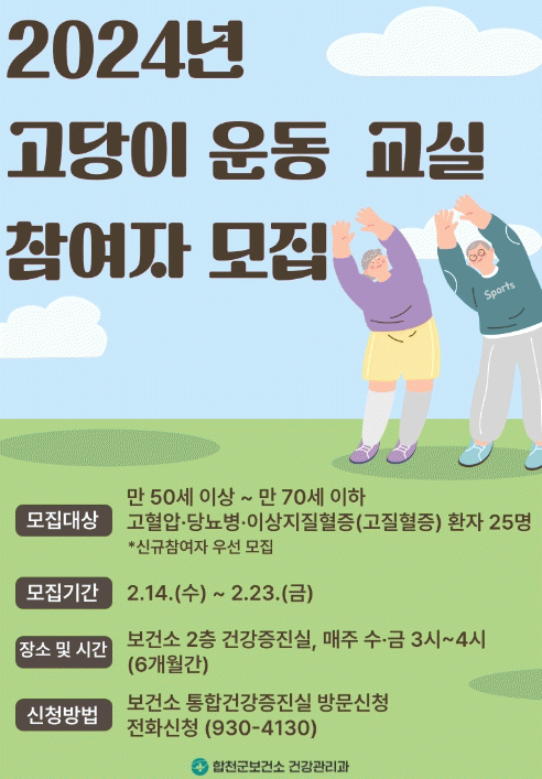 [HKSÇàÁ¤¹æ¼Û] ÇÕõ±º º¸°Ç¼Ò´Â 2¿ù 14ÀϺÎÅÍ 2¿ù 23ÀϱîÁö 2024³â °í´çÀÌ ¿îµ¿±³½Ç Âü°¡ÀÚ 25¸íÀ» ¸ðÁýÇÑ´Ù. °í´çÀÌ ¿îµ¿±³½ÇÀ̶õ, ¸¸¼ºÁúȯ(°íÇ÷¾Ð¡¤´ç´¢º´¡¤ÀÌ»óÁöÁúÇ÷Áõ) ȯÀÚ¿¡°Ô ¿îµ¿¿¡ ´ëÇÑ Çʿ伺À» Á¦°íÇÏ°í ¿îµ¿À» ÅëÇØ ½É¡¦