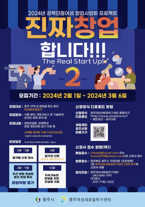 [HKSÇàÁ¤¹æ¼Û]2024³âµµ ÃæÁÖ¿©¼º»õ·ÎÀÏÇϱ⼾ÅÍ´Â ÃæÁֽà Áö¿øÀ¸·Î ÃæÁÖÁö¿ª ¿©¼º ¿¹ºñâ¾÷ÀÚÀÇ ¼º°øÀûÀΠâ¾÷Áö¿øÀ» À§ÇÑ Ã¢¾÷ÄÁ¼³ÆÃ ÇÁ·Î±×·¥'ÁøÂ¥ â¾÷ÇÕ´Ï´Ù!!! The Real Start Up!2'ÀÇ Âü¿©ÀÚ¸¦ ¸ðÁý ÇÑ´Ù. ü°èÈµÈ ÀÎÅ¥º£ÀÌÆÃ¡¦