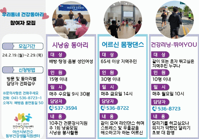 [HKSÇàÁ¤¹æ¼Û]¾Æ»ê½Ã º¸°Ç¼Ò µ¿ºÎ°Ç°»ýȰÁö¿ø¼¾ÅÍ´Â Áö¿ª ÁÖ¹ÎÀ» ´ë»óÀ¸·Î 3¿ùºÎÅÍ °Ç°µ¿¾Æ¸® ÇÁ·Î±×·¥À» ¿î¿µÇÑ´Ù. ½Ã ³¶¼Û, ¾î¸£½Å ¸ö¯ ¶óÀÎ´í½º, °Ç°·¯´×-¶Ù¾îYOU µî 3°³ÀÇ µ¿¾Æ¸®¸¦ ¿ì¼± ¿î¿µÇϰí Â÷ÈÄ ´Ù¸¥ µ¿¾Æ¸®µµ ¸ðÁý¡¤¿î¿µ¡¦