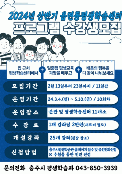 [HKSÇàÁ¤¹æ¼Û]ÃæÁֽô ½Ã¹ÎµéÀÇ ±Ù°Å¸® ÇнÀ±Ç º¸Àå°ú »ý¾ÖÁֱ⺰ ¸ÂÃãÇü Æò»ýÇнÀ ÇÁ·Î±×·¥À» Á¦°øÇϰíÀÚ 2024³â »ó¹Ý±â À¾¸éµ¿Æò»ýÇнÀ¼¾ÅÍ ÇÁ·Î±×·¥ ¼ö°»ýÀ» 2¿ù 13ÀϺÎÅÍ 2¿ù 23ÀϱîÁö ¸ðÁýÇÑ´Ù. À¾¸éµ¿ Æò»ýÇнÀ¼¾ÅÍ »ç¾÷Àº À¾¸é¡¦