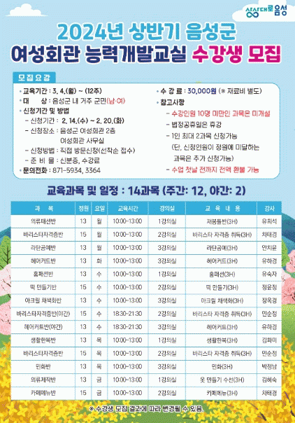 [HKSÇàÁ¤¹æ¼Û]À½¼º±ºÀº ¿À´Â 14ÀϺÎÅÍ 20ÀϱîÁö 2024³â »ó¹Ý±â ¿©¼ºÈ¸°ü ´É·Â°³¹ß ±³½Ç ¼ö°»ýÀ» ¸ðÁýÇÑ´Ù. 3¿ù 4ÀϺÎÅÍ 12ÁÖ°£ ÁøÇàµÇ´Â À̹ø ±³À°Àº À½¼º±º¿¡ ÁÖ¼ÒÁö¸¦ µÐ ¿©¼º¡¤³²¼º ´©±¸³ª ½Åû °¡´ÉÇϸç, Á¢¼ö ±â°£ ³» ½ÅºÐÁõÀ» Áö¡¦