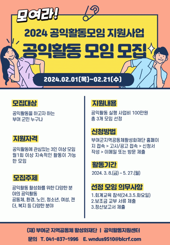 [HKSÇàÁ¤¹æ¼Û](Àç)ºÎ¿©±ºÁö¿ª°øµ¿Ã¼È°¼ºÈÀç´Ü ¼Ò¼Ó °øÀÍȰµ¿Áö¿ø¼¾ÅÍ(ÀÌÇÏ ¼¾ÅÍ)´Â ¿À´Â 21ÀϱîÁö ¡®»ó¹Ý±â °øÀÍȰµ¿¸ðÀÓ Áö¿ø»ç¾÷¡¯ÀÇ 3°³ Âü¿© ¸ðÀÓÀ» ¸ðÁýÇÑ´Ù.