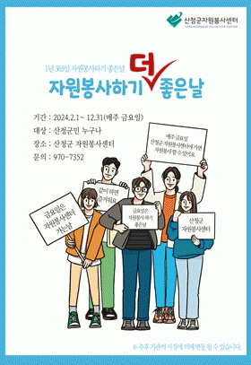 [¿µ³²±Ç] ¡°¸ÅÁÖ ±Ý¿äÀÏ ÀÚ¿øºÀ»ç Âü¿© ¾î¶°¼¼¿ä¡± »êû±ºÀÚ¿øºÀ»ç¼¾ÅÍ, ¡®ÀÚ¿øºÀ»çÇϱ⠴õ ÁÁÀº³¯¡¯ ¿î¿µ |2024. 02.01