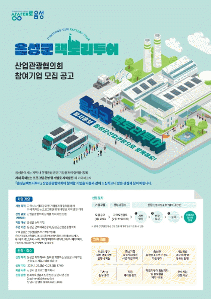 [HKSÇàÁ¤¹æ¼Û]À½¼º±ºÀº Áö¿ª ³» ±â¾÷üµé°úÀÇ Çù¾÷À» ÅëÇØ Ư»öÀÖ´Â »ê¾÷°ü±¤ ¿©ÇàÇÁ·Î±×·¥ °³¹ß°ú ¿î¿µÀ» À§ÇØ 2¿ù 23ÀϱîÁö À½¼º±º ÆÑÅ丮Åõ¾î »ê¾÷°ü±¤ÇùÀÇȸ Âü¿©±â¾÷À» ¸ðÁýÇÑ´Ù.
