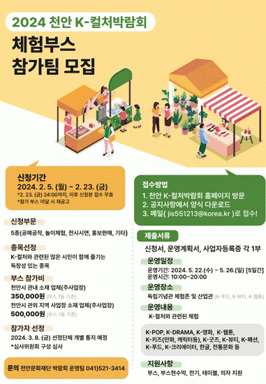 [HKSÇàÁ¤¹æ¼Û]õ¾È¹®ÈÀç´ÜÀº 2¿ù 5ÀϺÎÅÍ 23ÀϱîÁö ¡®2024 õ¾È K-ÄÃó¹Ú¶÷ȸ¡¯ Àü½Ã¡¤ÆÇ¸Å¡¤Ã¼Çè °ø°£ Âü°¡ÀÚ¸¦ ¸ðÁýÇÑ´Ù. ¡®2024 õ¾È K-ÄÃó¹Ú¶÷ȸ¡¯´Â ¿À´Â 5¿ù 22ÀϺÎÅÍ 26ÀϱîÁö 5Àϰ£ µ¶¸³±â³ä°ü¿¡¼ °³ÃֵǸç, K-ºäƼ¡¤Çªµå¡¤¡¦