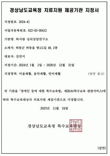 [¿µ³²±Ç] ÇÏ»ç¶û ½É¸®»ó´ã¿¬±¸¼Ò, Ư¼ö±³À° Ä¡·áÁö¿øÁ¦°ø±â°üÀ¸·Î Àç¼±Á¤ |2024. 01.15
