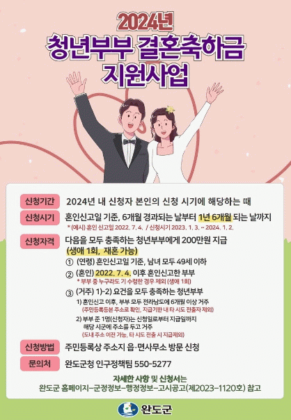 [È£³²±Ç] ¿Ïµµ±º, 'û³â ºÎºÎ °áÈ¥ÃàÇϱÝ' 200¸¸ ¿ø Áö¿ø |2024. 01.12