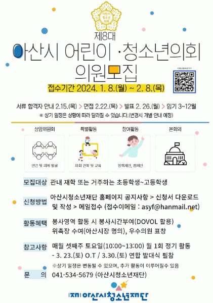[ÃæÃ»±Ç] ¾Æ»ê½Ã û¼Ò³âÀç´Ü, Á¦8´ë ¾Æ»ê½Ã ¾î¸°ÀÌ¡¤Ã»¼Ò³âÀÇȸ ÀÇ¿ø ¸ðÁý |2024. 01.10