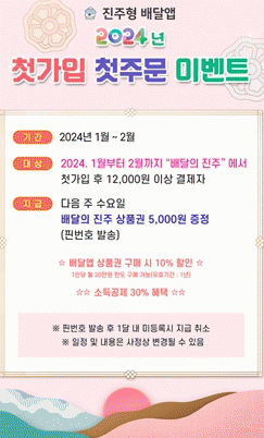 [HKSÇàÁ¤¹æ¼Û]ÁøÁֽô ¼Ò»ó°øÀÎ °æ¿µºÎ´ã ¿ÏÈ¿Í ÁøÁÖÇü °ø°ø ¹è´Þ¾Û Ȱ¼ºÈ¸¦ À§ÇÏ¿© 2024³â ù °¡ÀÔ¡¤Ã¹ ÁÖ¹® À̺¥Æ®¸¦ 1¿ùºÎÅÍ 2¿ù±îÁö ½ÃÇàÇÑ´Ù.