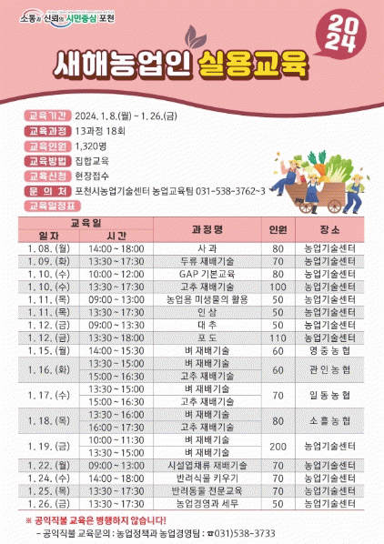 [HKSÇàÁ¤¹æ¼Û]Æ÷õ½Ã´Â ¿À´Â 2024³â 1¿ù 8ÀϺÎÅÍ 1¿ù 26ÀϱîÁö ³ó¾÷ÀεéÀÇ ÀÛ¸ñº° Àç¹è±â¼ú Çâ»óÀ» À§ÇÑ ¡®2024³â »õÇØ³ó¾÷ÀÎ ½Ç¿ë±³À°¡¯À» ÃßÁøÇÑ´Ù.