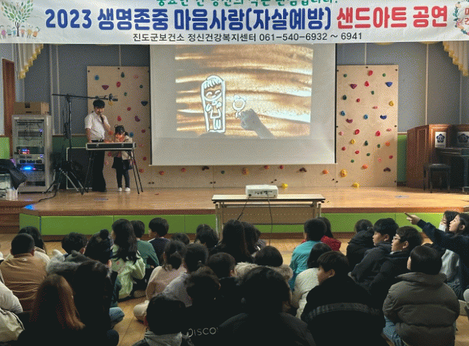 [HKSÇàÁ¤¹æ¼Û]Áøµµ±º º¸°Ç¼Ò°¡ »ý¸íÁ¸Áß ¸¶À½»ç¶û(Àڻ쿹¹æ) ¸ð·¡ ¿¹¼ú(»÷µå¾ÆÆ®) °ø¿¬À» ½Ç½ÃÇß´Ù. À̹ø °ø¿¬Àº ±Ý¼ºÃÊ, ±º³»ºÏÃÊ, ¿À»êÃÊ, °í¼ºÃÊ µî 4°³ Çб³ÀÇ Çлýµé°ú ±³Á÷¿øÀ» ´ë»óÀ¸·Î ¸ð·¡ ¿¹¼ú(»÷µå¾ÆÆ®) °ø¿¬À» ÅëÇØ »ý¸í¿¡ ¡¦