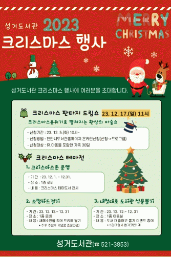[HKSÇàÁ¤¹æ¼Û] õ¾È½Ã ¼º°Åµµ¼°ü(°üÀå ÀÌÃæ¹Ì)Àº 12¿ù ¿¬¸»À» ¸Â¾Æ ½Ã¹Î¿¡°Ô Áñ°Å¿î Ãß¾ïÀ» ¸¸µé¾î ÁÖ°íÀÚ Å©¸®½º¸¶½º Çà»ç¸¦ ¿î¿µÇÑ´Ù°í 30ÀÏ ¹àÇû´Ù. µµ¼°üÀº Å©¸®½º¸¶½º¸¦ ÁÖÁ¦·Î °ü·Ã µµ¼¸¦ Àü½ÃÇϰí, »õÇØÀÇ ¼Ò¿øÀ» ºô¾îº¸¡¦