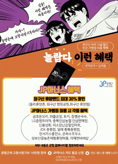 [HKSÇàÁ¤¹æ¼Û]ÃæºÏ ÁõÆò±ºÀÌ JP¾Æ³Ê½º Á¦µµ ¿î¿µ ½ÃÀÛÀ» ¾Ë·È´Ù. JP¾Æ³Ê½º´Â ÁõÆò±º °íÇâ»ç¶û±âºÎÁ¦¿¡ Âü¿©ÇÑ ±âºÎÀÚ¿¡°Ô °ø°ø½Ã¼³°ú JP¾Æ³Ê½º °¡¸ÍÁ¡ ÀÌ¿ë ½Ã °¢Á¾ ÇýÅÃÀ» Á¦°øÇÏ´Â Á¦µµ´Ù. ´ë»ó °ø°ø½Ã¼³Àº À²¸®ÈÞ¾çÃÌ, Á±¸»ê Ä·ÇΡ¦