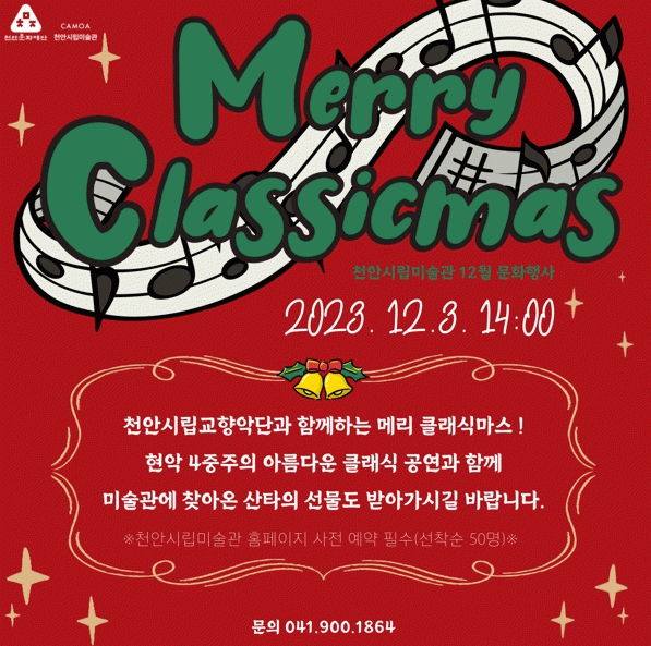[HKSÇàÁ¤¹æ¼Û]õ¾È½Ã¸³¹Ì¼ú°üÀÌ 12¿ù 3ÀÏ Ãµ¾È½Ã¸³±³Çâ¾Ç´Ü°ú ÇÔ²²ÇÏ´Â ¡®¸Þ¸® Ŭ·¡½Ä¸¶½º ÄܼƮ¡¯¸¦ °³ÃÖÇÑ´Ù. 12¿ù ¹®ÈÇà»çÀÎ À̹ø °ø¿¬Àº õ¾È½Ã¸³±³ÇâÇÐ´Ü ¼Ò¼Ó ¿¬ÁÖÀÚµéÀÇ Çö¾Ç »çÁßÁÖ·Î ±¸¼ºµÇ¸ç, ¹Ì¼ú°üÀ» ã´Â °ü¶÷°´µéÀÌ µû¶æ¡¦