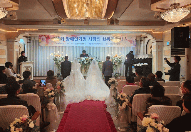 [HKSÇàÁ¤¹æ¼Û]ÀӽDZº°ú ÀӽDZºÀå¾ÖÀο¬ÇÕȸ´Â 24ÀÏ ¿À¼ö ¹Ì¹Ì¿þµùȦ¿¡¼ Àå¾ÖÀΰ¡Á¤ »ç¶ûÀÇ ÇÕµ¿°áÈ¥½ÄÀ» °ÅÇàÇß´Ù. À̹ø ÇÕµ¿°áÈ¥½Ä¿¡¼´Â ¿©·¯ °¡Áö »çÁ¤À¸·Î °áÈ¥½ÄÀ» ¿Ã¸®Áö ¸øÇÑ Àå¾ÖÀÎ ºÎºÎ2½ÖÀ» À§ÇØ ¸¶·ÃµÆÀ¸¸ç °¡Á·, Çϰ´ µî 1¡¦