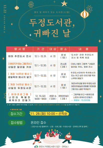 [HKSÇàÁ¤¹æ¼Û]õ¾È½Ã µÎÁ¤µµ¼°üÀÌ ¿µÎ ´Þ Å׸¶°¡ ÀÖ´Â µµ¼°üÀÇ 12¿ù Å׸¶ÀÎ ¡®µµ¼°ü¡¯°ú °ü·ÃµÈ ´Ù¾çÇÑ ÇÁ·Î±×·¥À» ¿î¿µÇÑ´Ù. µÎÁ¤µµ¼°üÀº Ã¥°ú Ä£¼÷ÇØÁö´Â °è±â¸¦ ¸¶·ÃÇϰíÀÚ µ¶¼¿Í ¿¬°èµÈ ´Ù¾çÇÑ Å׸¶ ÇÁ·Î±×·¥ÀÎ ¡®¿µÎ ´Þ Åס¦