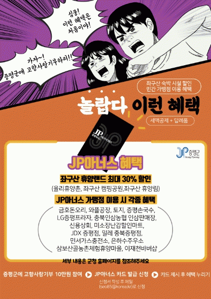[HKSÇàÁ¤¹æ¼Û]ÃæºÏ ÁõÆò±ºÀÌ JP¾Æ³Ê½º Á¦µµ ¿î¿µ ½ÃÀÛÀ» ¾Ë·È´Ù. JP¾Æ³Ê½º´Â ÁõÆò±º °íÇâ»ç¶û±âºÎÁ¦¿¡ Âü¿©ÇÑ ±âºÎÀÚ¿¡°Ô °ø°ø½Ã¼³°ú JP¾Æ³Ê½º °¡¸ÍÁ¡ ÀÌ¿ë ½Ã °¢Á¾ ÇýÅÃÀ» Á¦°øÇÏ´Â Á¦µµ´Ù. ´ë»ó °ø°ø½Ã¼³Àº À²¸®ÈÞ¾çÃÌ, Á±¸»ê Ä·ÇΡ¦