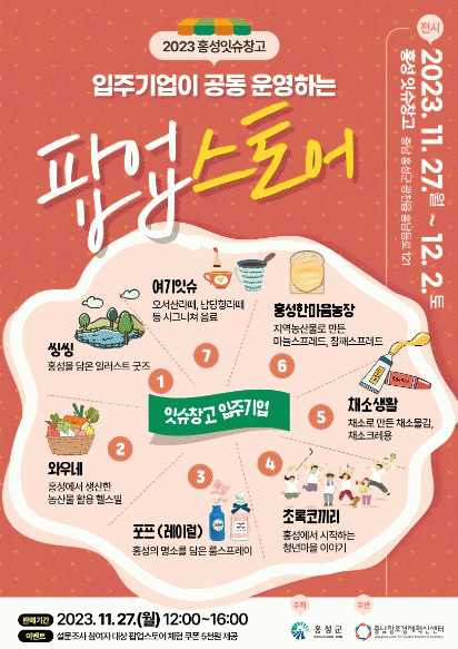[HKSÇàÁ¤¹æ¼Û]È«¼º±ºÀº ¿À´Â 11¿ù 27ÀϺÎÅÍ 12¿ù 2ÀϱîÁö È«¼ºº¹ÇÕ¹®Èâ¾÷°ø°£ ÀÕ½´Ã¢°í¿¡¼ ÀÔÁÖ±â¾÷ °øµ¿ ¡®ÆË¾÷½ºÅä¾î¡¯¸¦ ¿î¿µÇÑ´Ù°í ¹àÇû´Ù. ÆË¾÷½ºÅä¾î¿¡¼´Â ÀÕ½´Ã¢°í ÀÔÁÖ±â¾÷ û³â â¾÷°¡ 7°³ ±â¾÷ÀÇ »ç¾÷ ¾ÆÀÌÅÛÀ» È«º¸ÇÏ°í¡¦