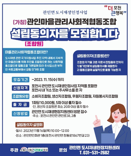 [¼öµµ±Ç] Æ÷õ½Ã, °üÀÎ¸é µµ½ÃÀç»ýÇöÀåÁö¿ø¼¾ÅÍ °üÀθ¶À»°ü¸®»çȸÀûÇùµ¿Á¶ÇÕ ¼³¸³µ¿ÀÇÀÚ ¸ðÁý |2023. 11.09