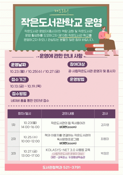 [HKSÇàÁ¤¹æ¼Û]õ¾È½Ã µµ¼°üº»ºÎ´Â °ø¡¤»ç¸³ ÀÛÀºµµ¼°ü 75°³¼Ò ¿î¿µÀÚ¸¦ ´ë»óÀ¸·Î ¡®2023³â Á¦13ȸ ÀÛÀºµµ¼°üÇб³¡¯¸¦ ¿î¿µÇÑ´Ù°í ¹àÇû´Ù. À̹ø ±³À°Àº °ø¡¤»ç¸³ ÀÛÀºµµ¼°üÀÇ ¿î¿µ Ȱ¼ºÈ¿Í ÀÌ¿ëÀÚ ¼ºñ½º Áú Çâ»óÀ» À§ÇØ ¸¶·ÃµÆÀ¸¸ç¡¦