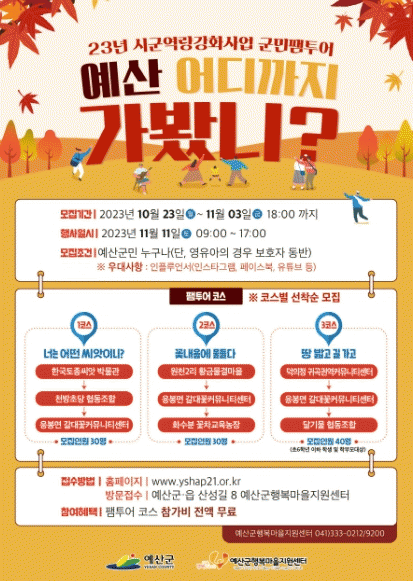 [HKSÇàÁ¤¹æ¼Û]¿¹»ê±ºÇູ¸¶À»Áö¿ø¼¾ÅÍ´Â ¿¹»ê±ºÀÇ ´ëÇ¥ÀûÀÎ °ü±¤Áö »Ó¸¸ ¾Æ´Ï¶ó, ¸¶À» °÷°÷ÀÇ ´Ù¾çÇÑ º¼°Å¸®, Áñ±æ °Å¸®, üÇè °Å¸®¸¦ »õ·Ó°Ô ¹ß°ßÇÏ°í ¾Ë¾Æ°¡´Â ¡®¿¹»ê ¾îµð±îÁö °¡ºÃ´Ï?!¡¯ ±º¹Î ÆÔÅõ¾î¿¡ Âü°¡ÇÒ ÁÖ¹ÎÀ» ¿À´Â 11¿ù 3Àϱ |