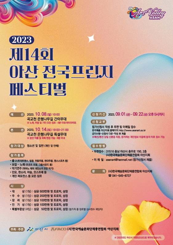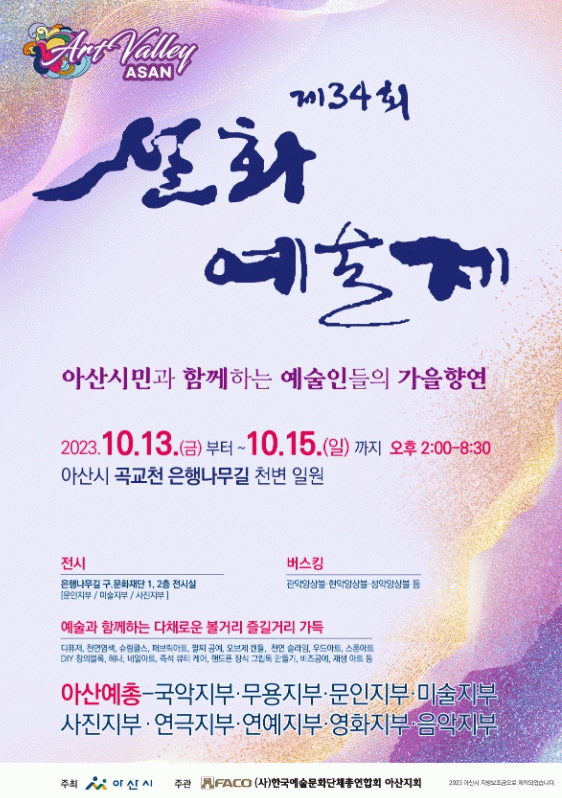 [HKSÇàÁ¤¹æ¼Û]¾Æ»ê½Ã°¡ ÁÖÃÖÇϰí, (»ç)Çѱ¹¿¹¼ú¹®È´ÜüÃÑ¿¬ÇÕȸ ¾Æ»êÁöȸ(ÁöȸÀå À̵¿Çö)°¡ ÁÖ°üÇÏ´Â ¡®2023 Á¦34ȸ ¼³È¿¹¼úÁ¦¡¯°¡ ¿À´Â 10¿ù 13~15ÀÏ °î±³Ãµ ÀºÇ೪¹«±æ õº¯ ÀÏ¿ø¿¡¼ ¸·À» ¿Ã¸°´Ù. À̹ø ¼³È¿¹¼úÁ¦´Â ¡®¾Æ»ê½Ã¹Î°ú ¡¦